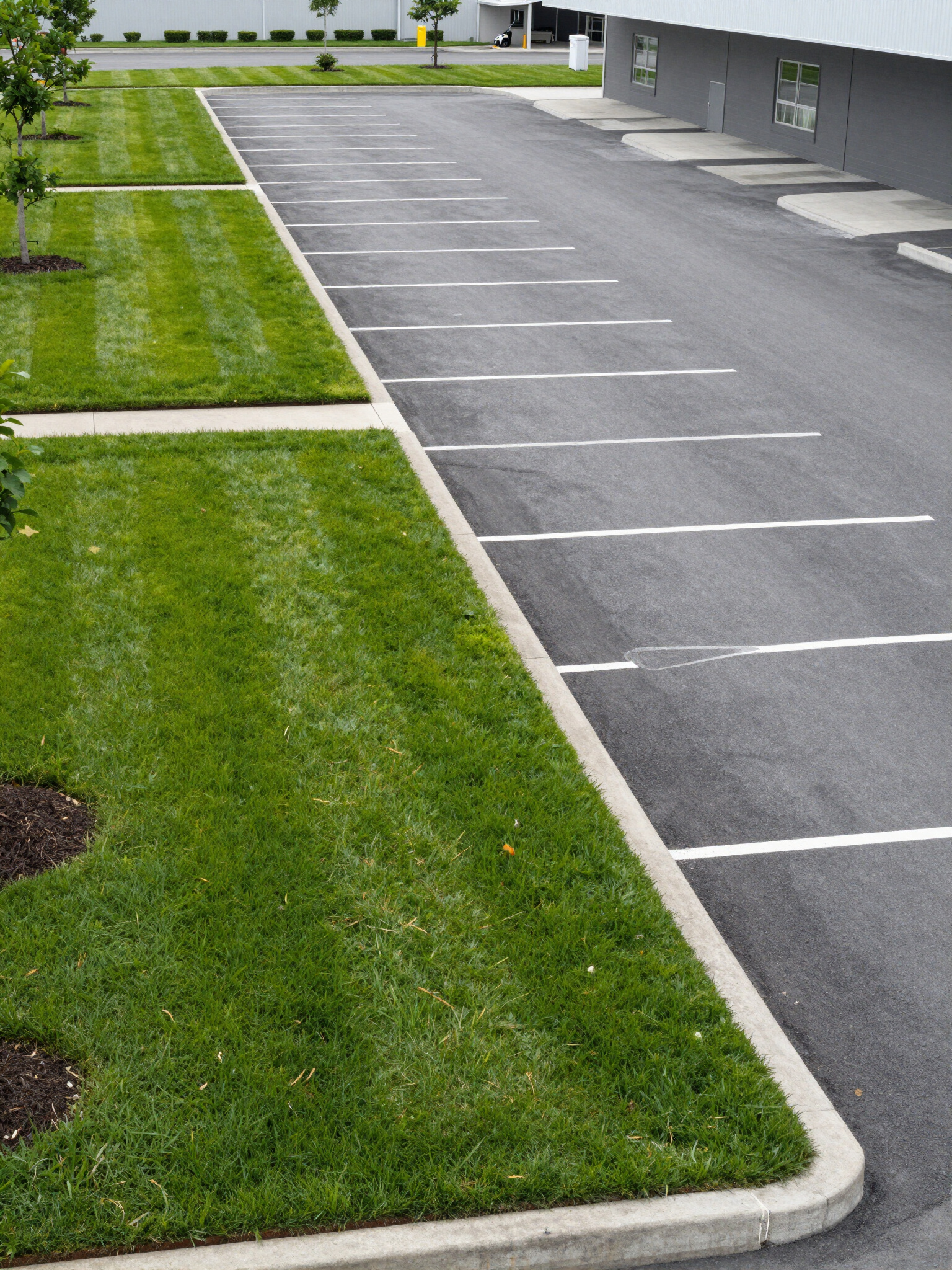 Large commercial property with even, healthy grass and clean lines that boost curb appeal for customers.
