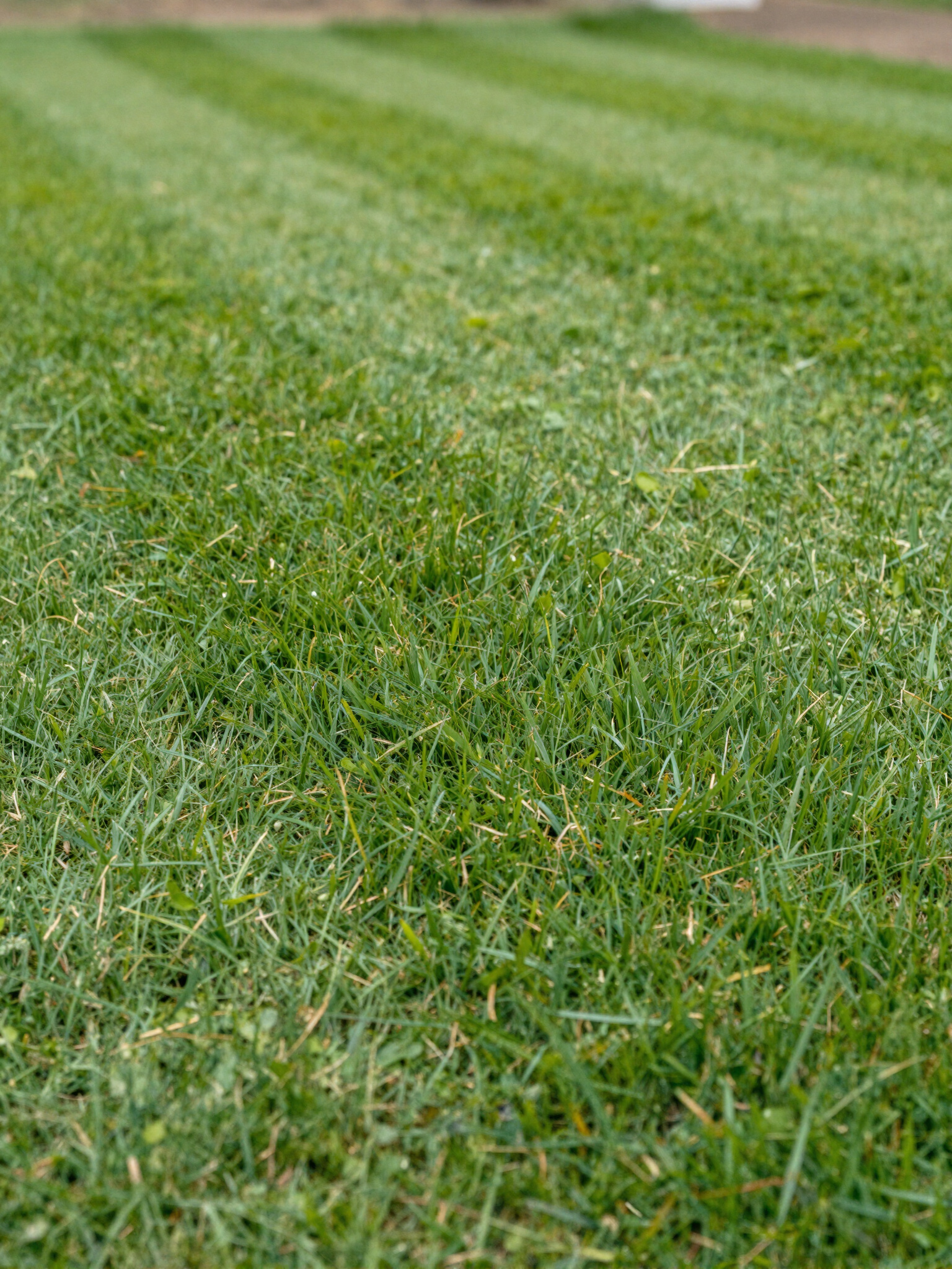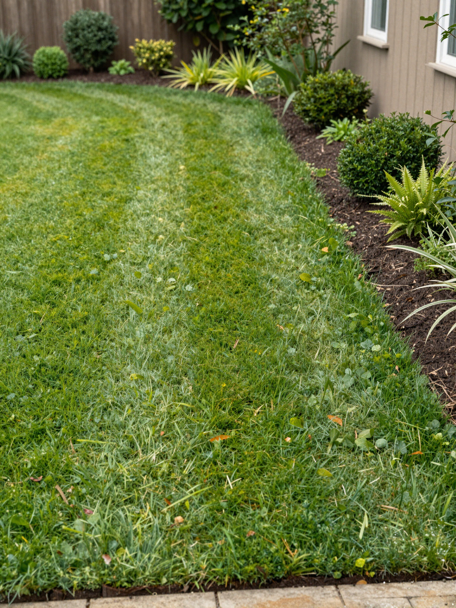 Narrow side yard with bold mowing stripes, perfect for tight spaces that still need to look sharp.